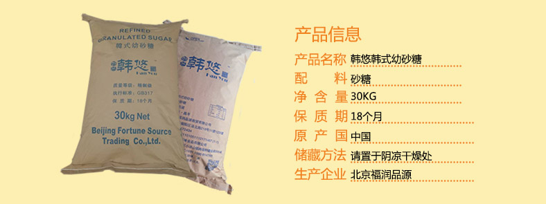 韓悠白砂糖是采用韓國進口優質原料,在國內用以先進工藝加工精煉而成,產品水分含量極少,具有純度高、潔白、晶粒幼細、速溶等優點,是目前市場上較為高檔的食用幼砂糖。
